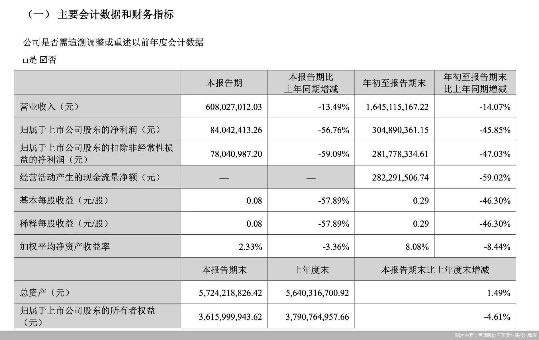 百润股份业绩报告数据显示,2022年三季度,百润股份实现营收约6.08亿元,同比下降13.49%;实现净利润约8404.24万元,同比下降56.76%。2022年上半年,百润股份实现营收约10.37亿元,同比下降14.41%;实现净利润约2.21亿元,同比下降40.10%。2022年一季度,百润股份实现营收约5.39亿元,同比增长4.14%;实现净利润约9175.49万元,同比下降29.94%。2022年中,百润股份多个季度出现营收、净利润双下滑。
